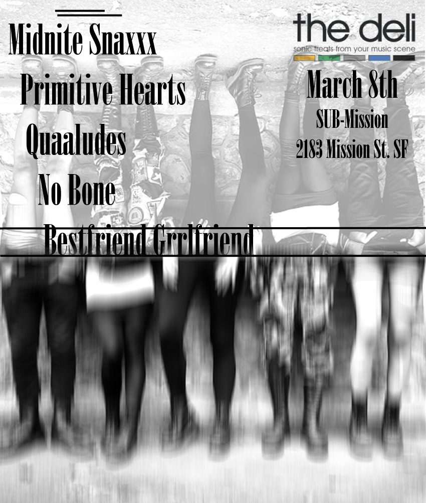 On March 8th at Amnesia in San Francisco, CA, The Deli Magazine San Francisco will be throwing an event to benefit the Bay Area Girls Rock Camp by giving a part of the proceeds from their upcoming event featuring performances by female fronted bands, Midnite Snaxxx, Primitive Hearts, Quaaludes, No Bone and Bestfriend Grrlfriend.
